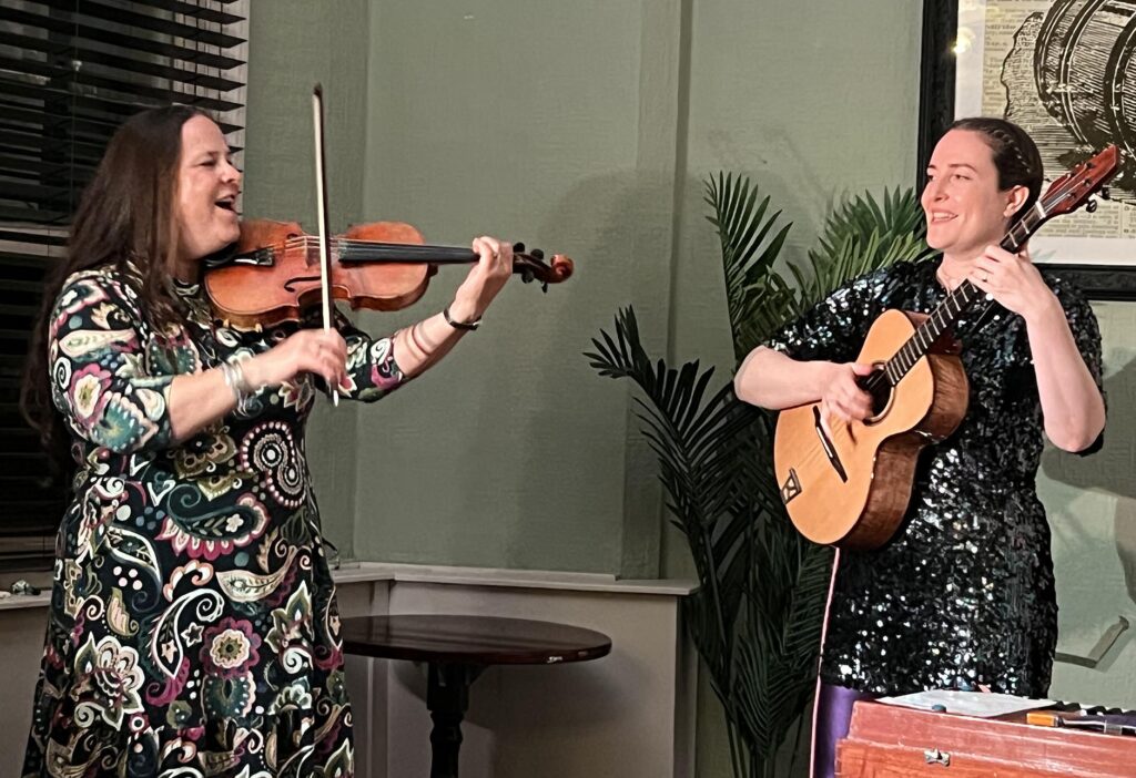 On 17th September 2025, Bryony Griffith and Alice Jones treated us to a most enjoyable evening of fine vocal harmonies and varied instrumentation. Alice switched back and forth between tenor guitar (declared a ‘Tena guitar’ at one point) and harmonium, while Bryony’s fiddle-playing mixed bowing with plenty of effective plucking. The pair also performed a fair few songs a cappella.
